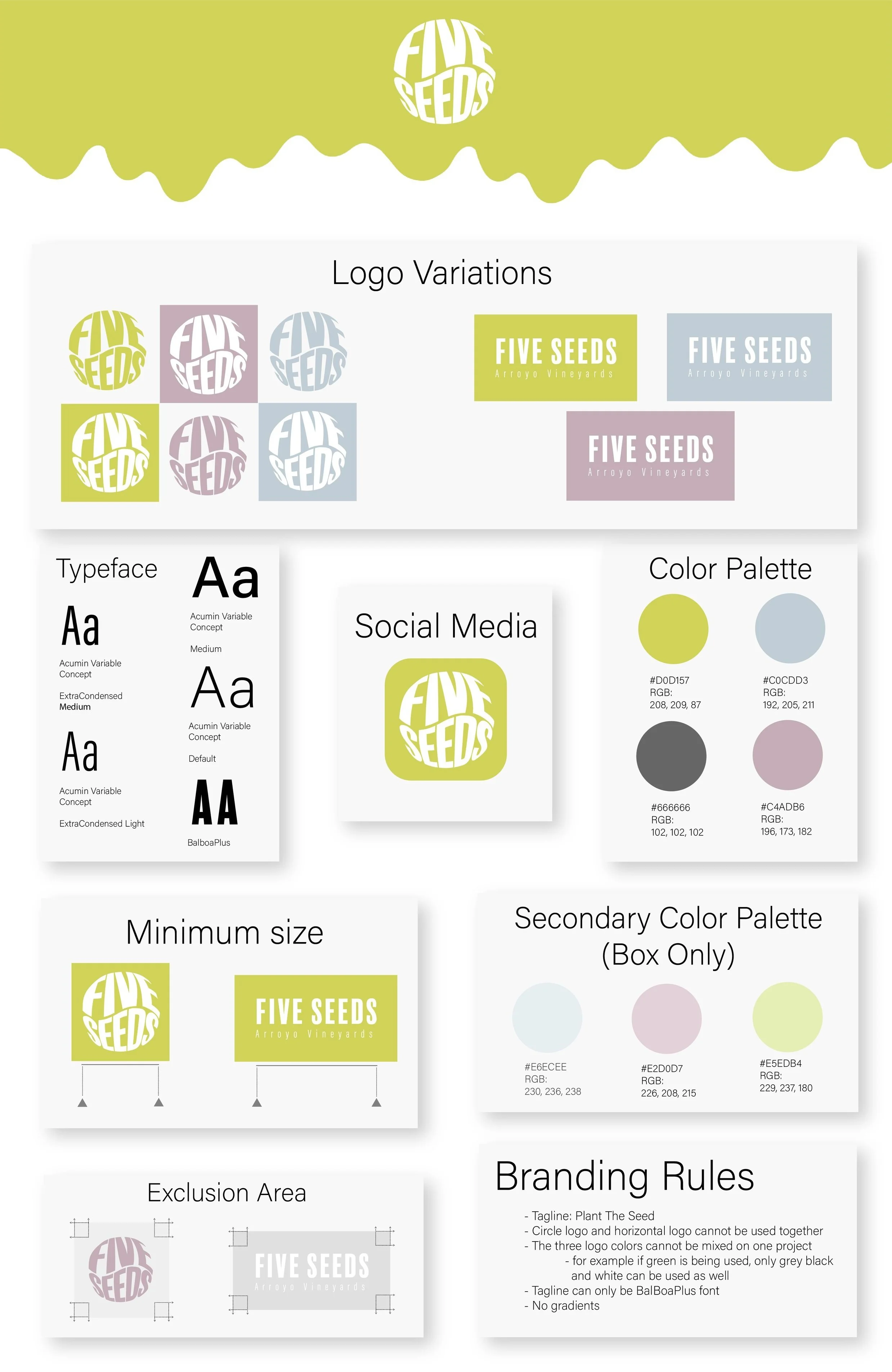 The brand guideline for Five Seeds included a total of 9 logo variations, typefaces, a color palette, sizing, exclusion areas and general rules.